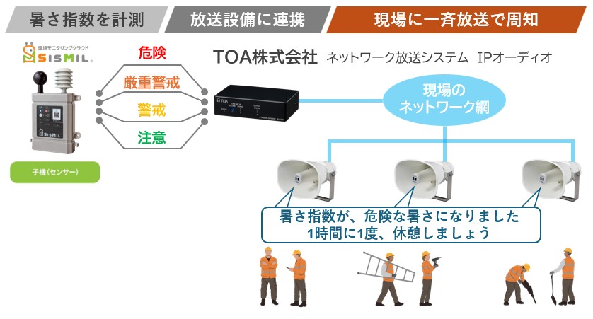 TOA株式会社(本社:神戸市、代表取締役社長:谷口方啓)は、ネットワーク放送システム「IPオーディオシリーズ」を、株式会社オーク情報システム(本社:東京都品川区、代表取締役社長:安井勝俊)が提供する環境モニタリングクラウド「SisMil」にシステム連携することで、作業現場や施設における暑熱リスクを一斉に周知する「音声放送連携オプション」を2026年4月上旬より提供開始します。